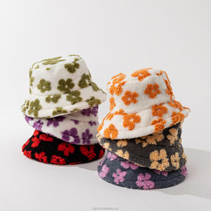 Unisex Outdoor Trendy 3D Velour Bordado Balde Ajustável Chapéu Extra Fofo Flor De Pelúcia Vermelho Amarelo Quatro Estações para